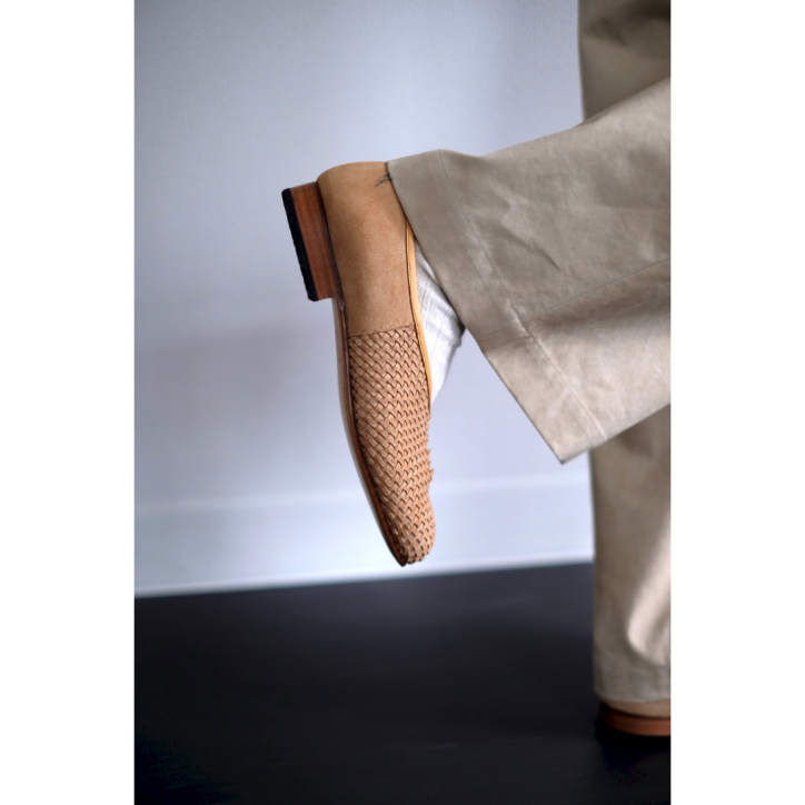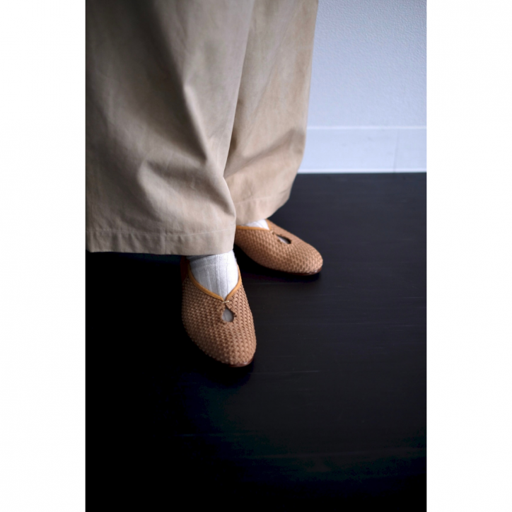 イントレチャートとも呼ばれる技法で、テープ状にしたレザーを手作業で編み込む手間のかかるアッパーは単色なのにとても華やか。