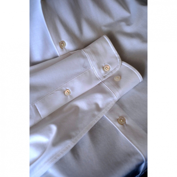 ディティールは、ドレスシャツを採用し全て巻き伏せ本縫い仕様、貝蝶釦使いです。