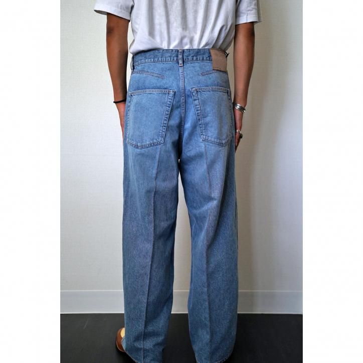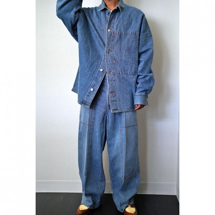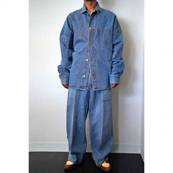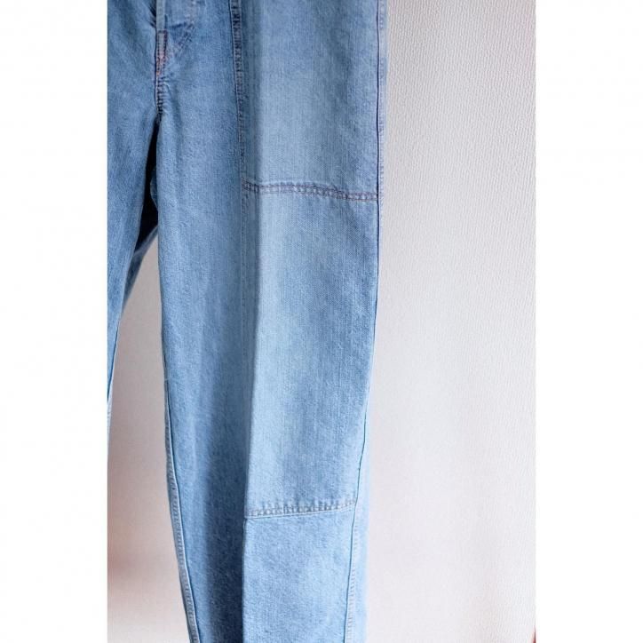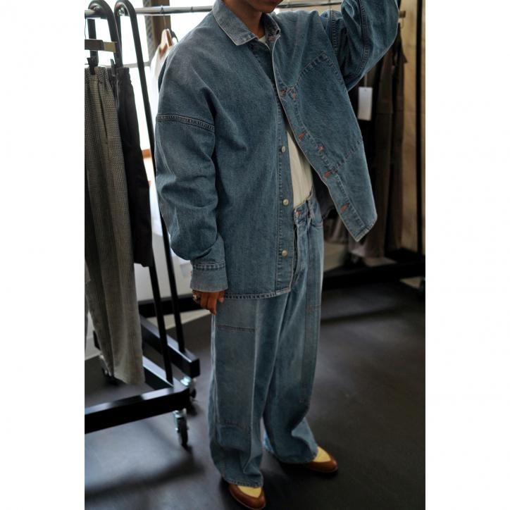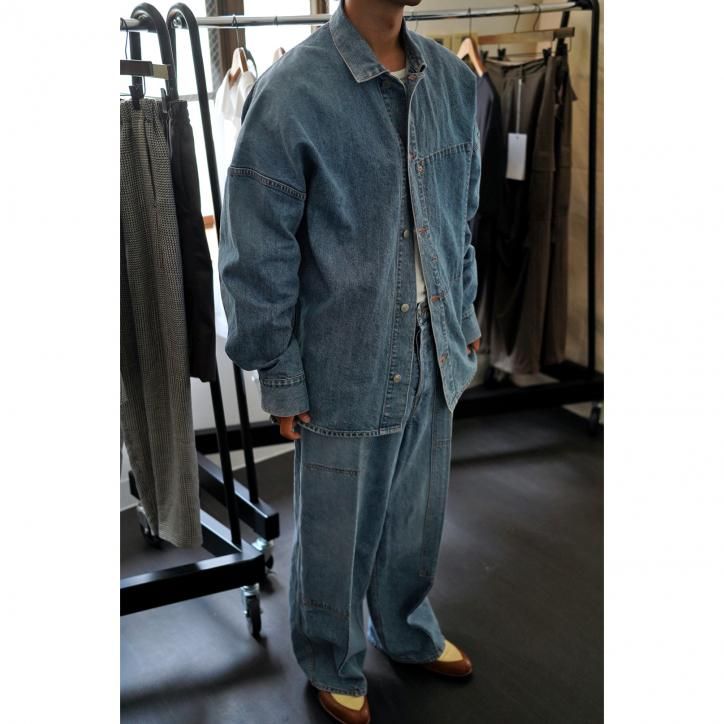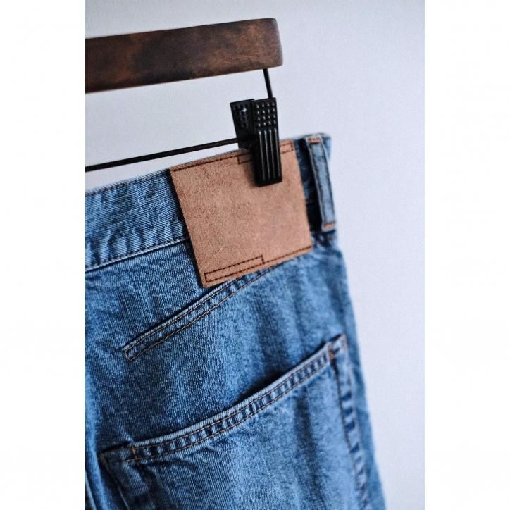 脂の抜けたようなドライタッチのデニムを作りたい、というコンセプトから生まれたデニム素材。経糸にインディゴコットン、緯糸に和紙を使用し、古い織機で低速で丁寧に織り上げています。