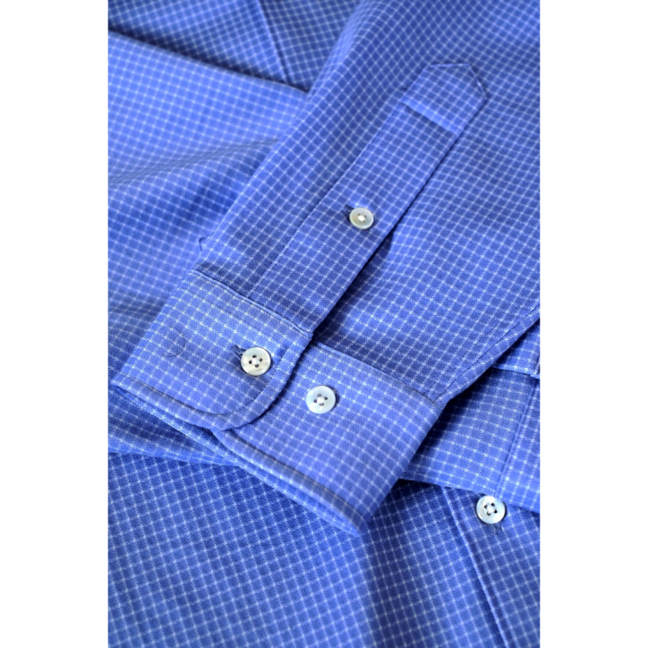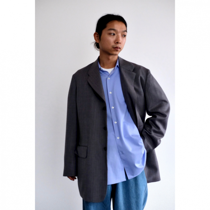 ディティールは、ドレスシャツを採用し全て巻き伏せ本縫い仕様、貝蝶釦使いです。