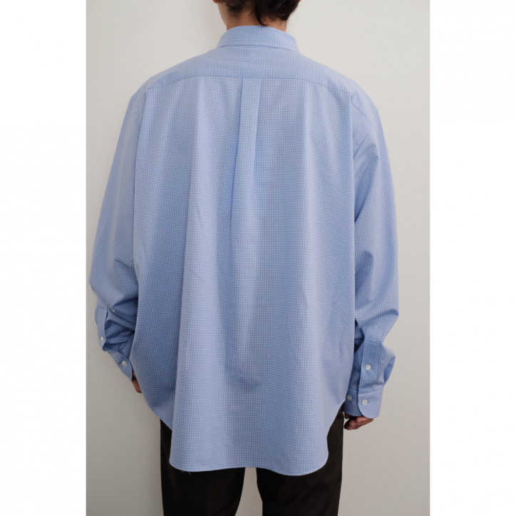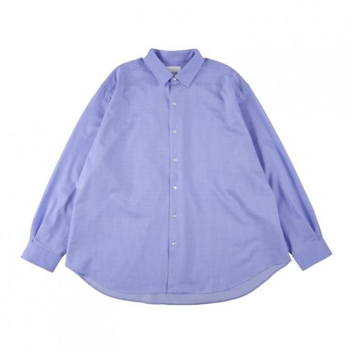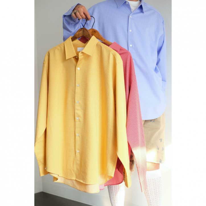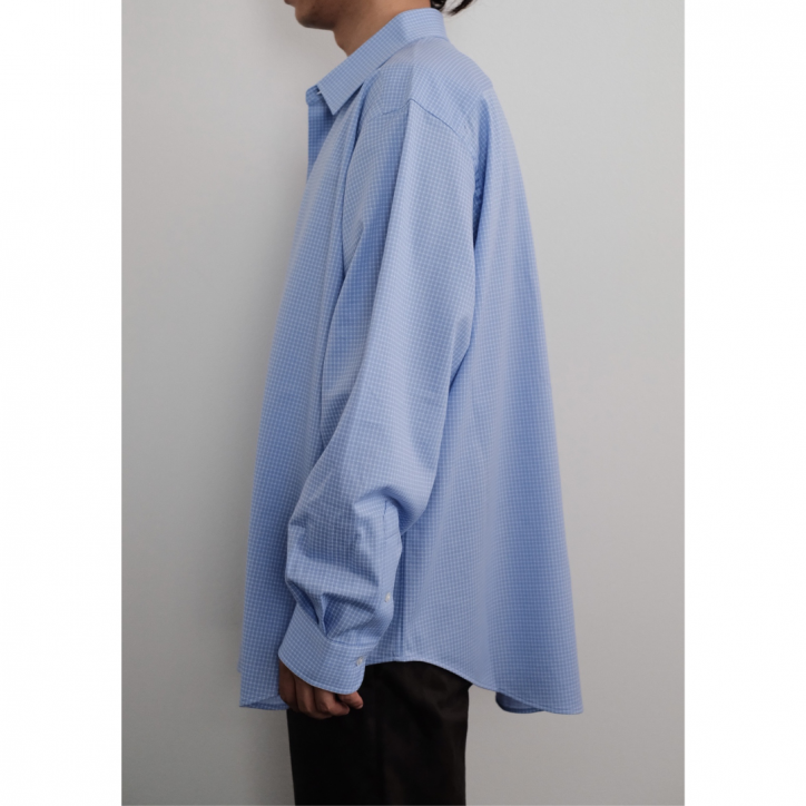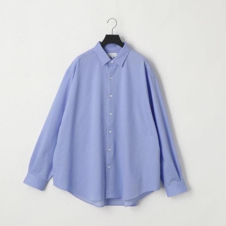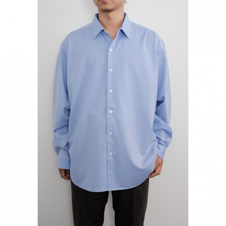 75D高捲縮リサイクルポリエステルを使用し、ストレッチ性を出しております。釦裏側にブランドロゴを入れております。KANEMASA PHIL.の定番ルーズシルエットシャツ。