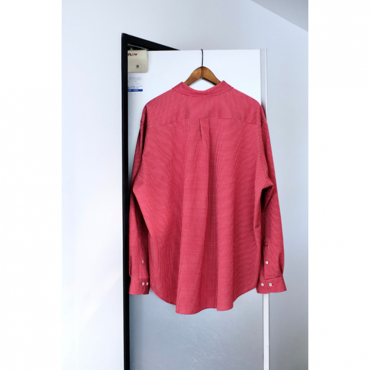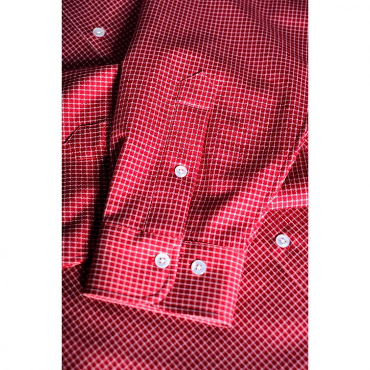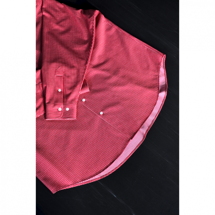 ディティールは、ドレスシャツを採用し全て巻き伏せ本縫い仕様、貝蝶釦使いです。