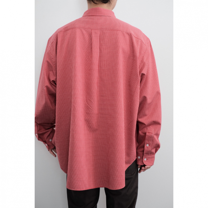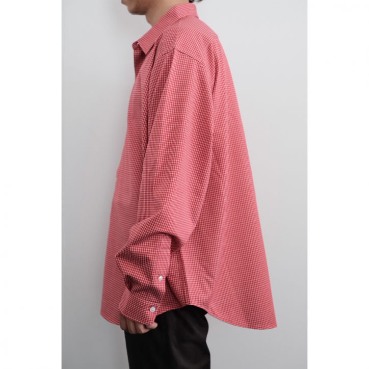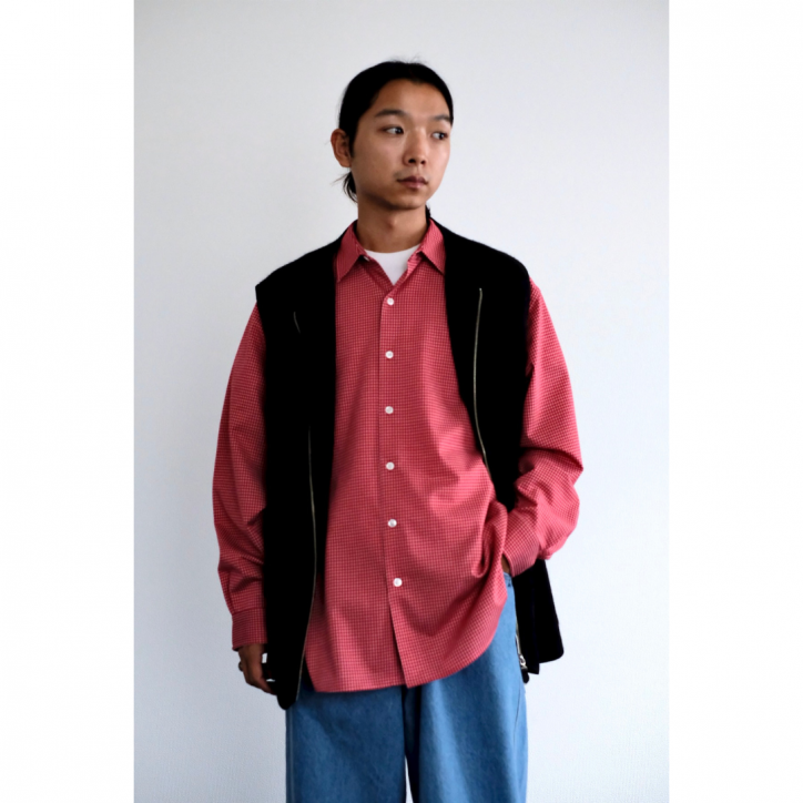 75D高捲縮リサイクルポリエステルを使用し、ストレッチ性を出しております。釦裏側にブランドロゴを入れております。KANEMASA PHIL.の定番ルーズシルエットシャツ。