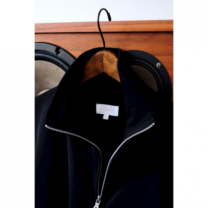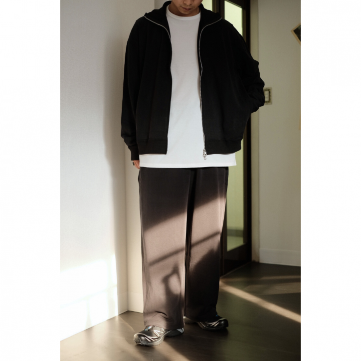 光沢感のある生地と相反する、リラックスなディティールを付けております。モダンフィットなシルエットが特徴。
