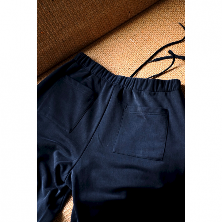 ウエストや裾を絞った際の生地のたまりなどが綺麗に出るように素材を最大限に活かした