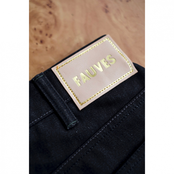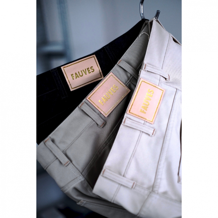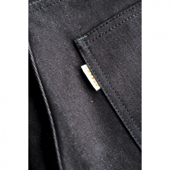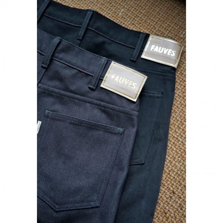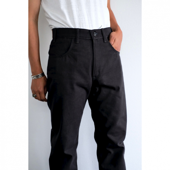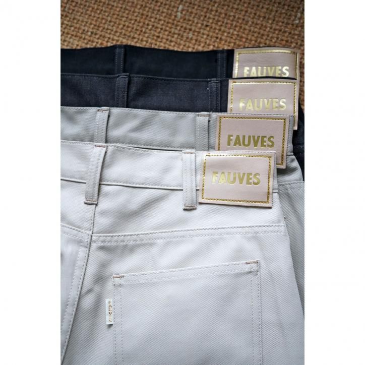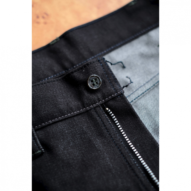 部分的に上糸と下糸の色を変えチェーンステッチで縫製、オリジナルのボタン、パッチ、履いているうちに自然に気づく絶妙な新しさがあるはずです。