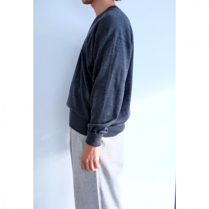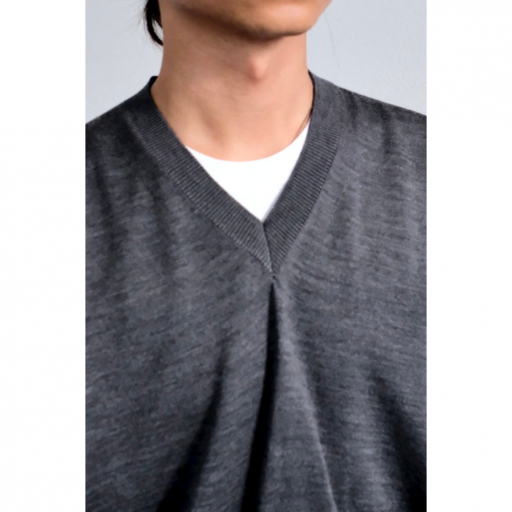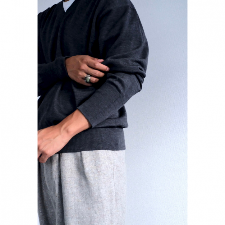 Vネックの深さが浅すぎず深すぎずのちょうど良いバランス感でスタイリングに程よい抜け感を演出してくれます。インナーがタンクトップでも全くいやらしさがなく着れる、Vネックを着たことのない方、抵抗のある方にも自信を持ってオススメできるバランス感があります。
