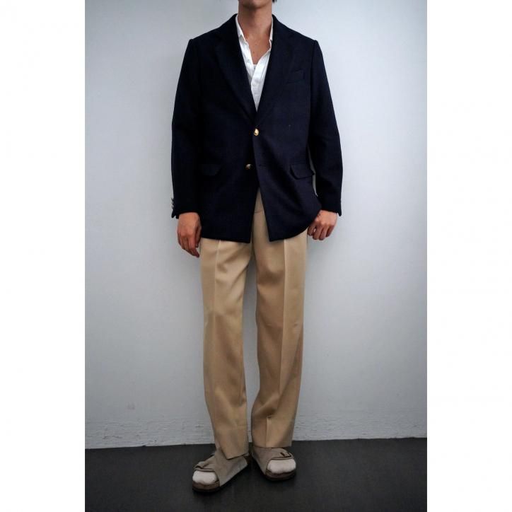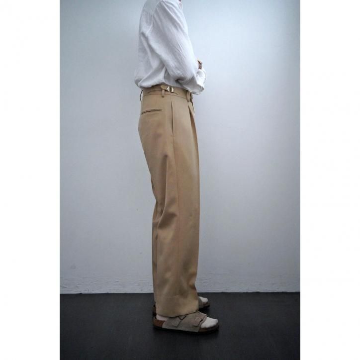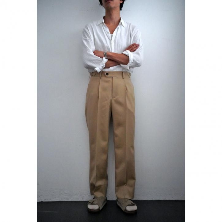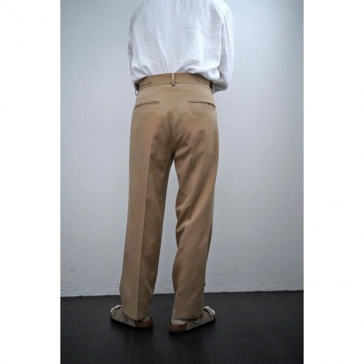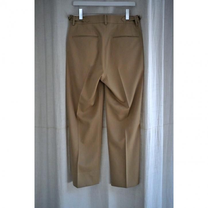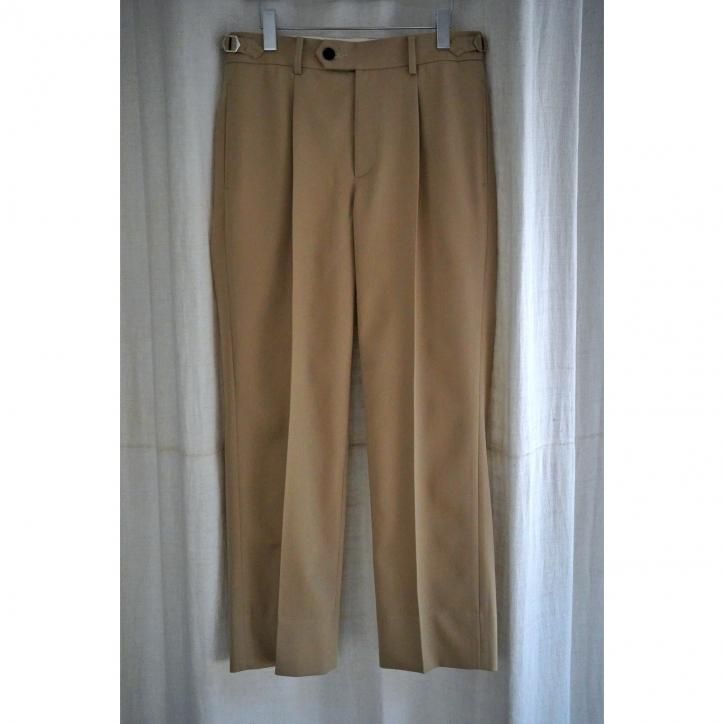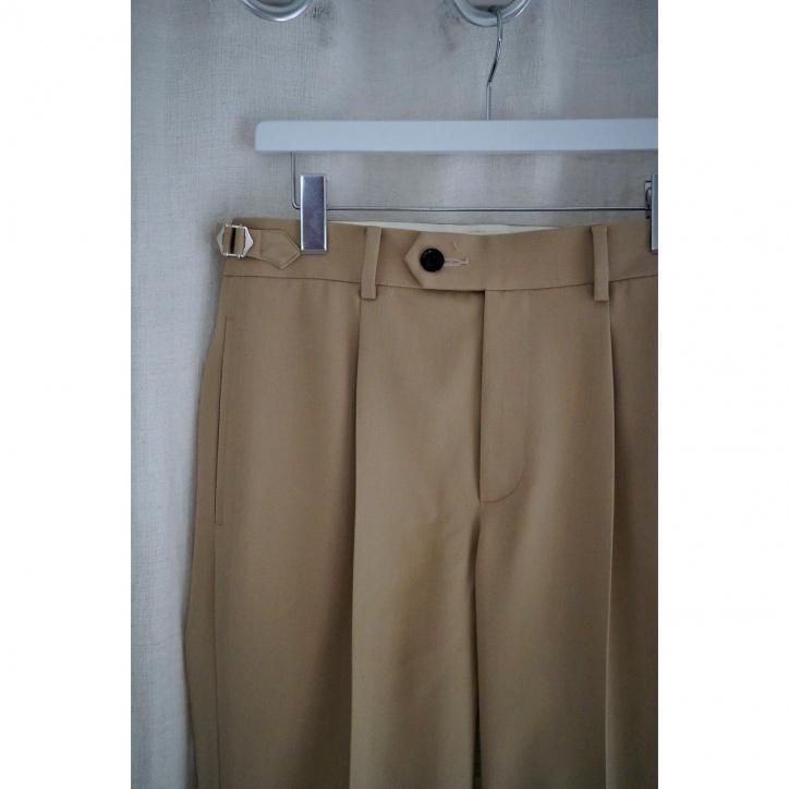 しっかりした重みのあるウールギャバを用いたベージュのトラウザーズ。