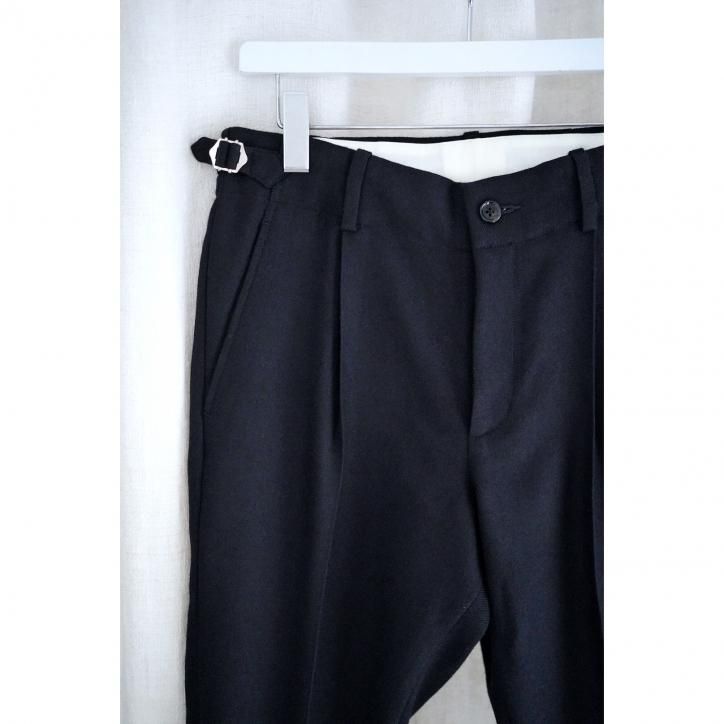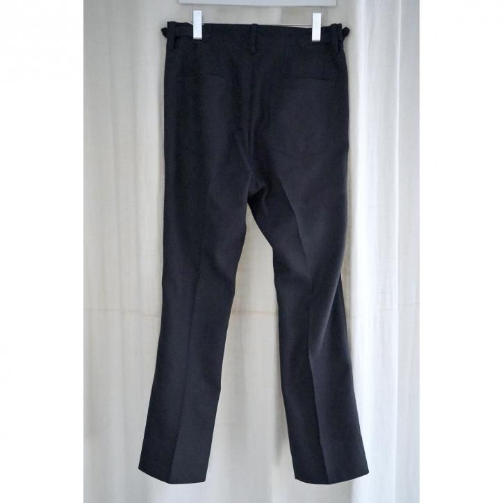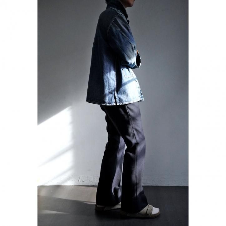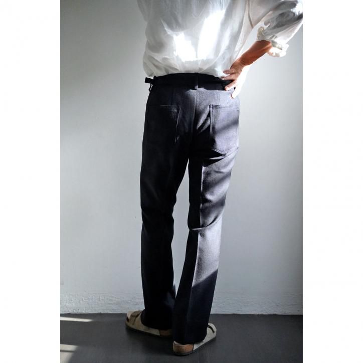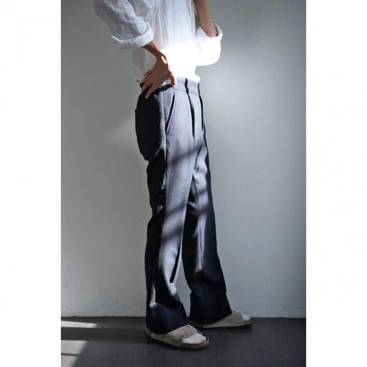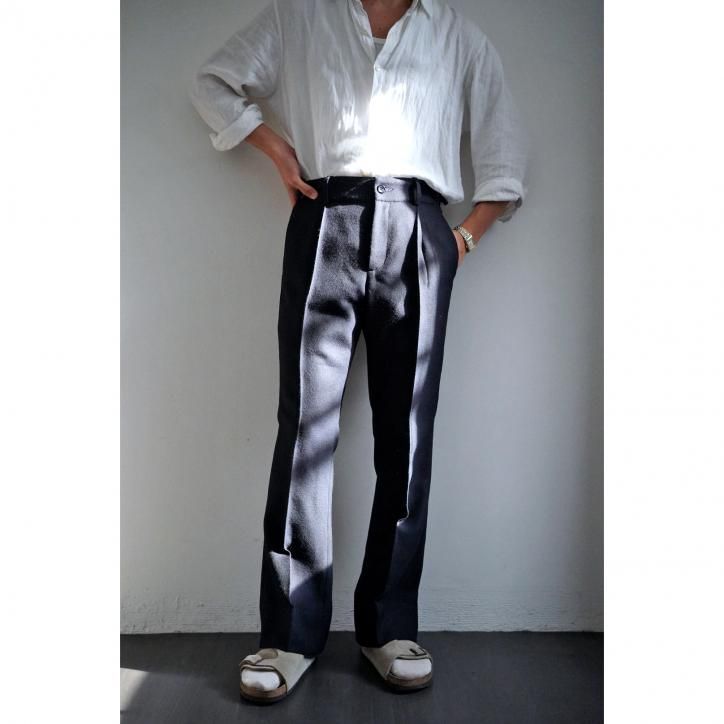 股上浅め、1タックのエグいカーブを描くフレアトラウザーズです。