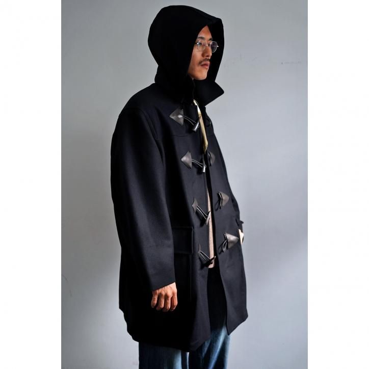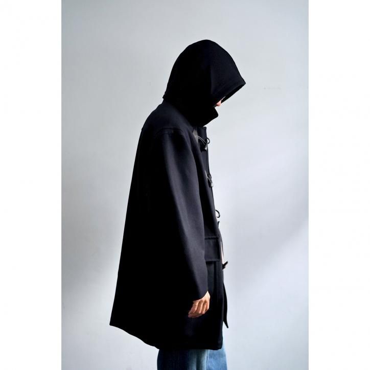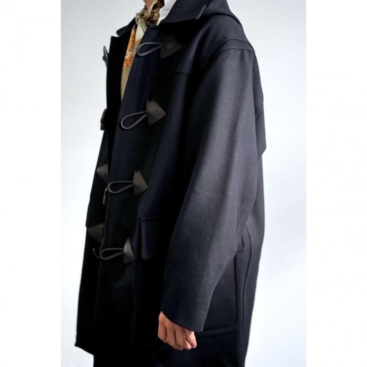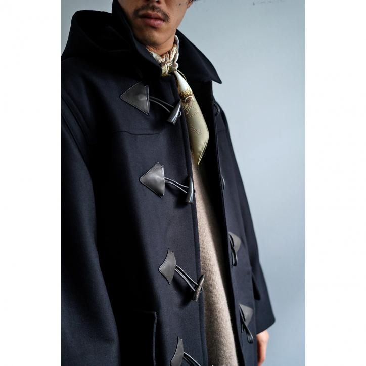 "梳毛のタスマニアウールを使用したホースライディングメルトンダッフルコート。20世紀初頭のイギリス海軍で広く採用されたウールコートをリファレンスとし、様々な国のダッフルコートの要素を編集して現代的に再設計しています。特注で製作したメルトン生地のオイルの抜けたようなドライな風合いと、プレス仕上げによる艶感も特徴です。レザーパーツにはフランスのHAAS社のアルザスレザーを使用しています。"