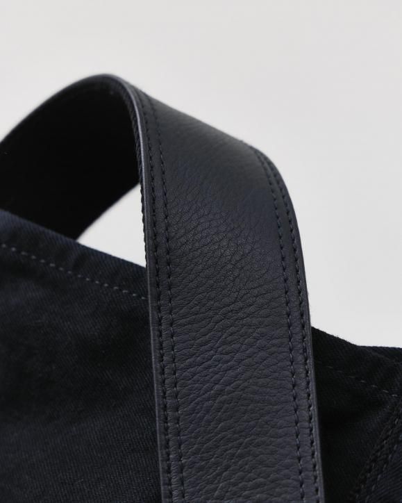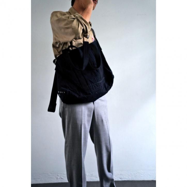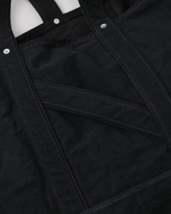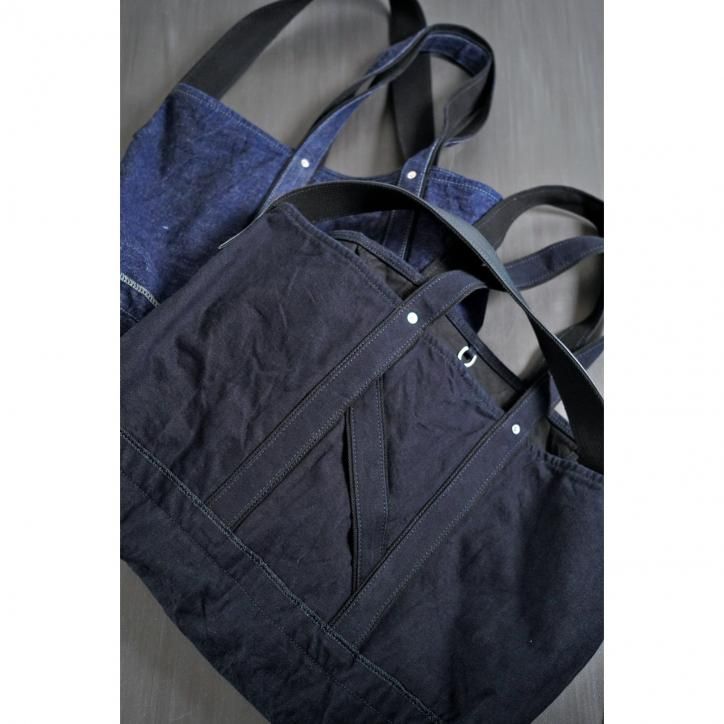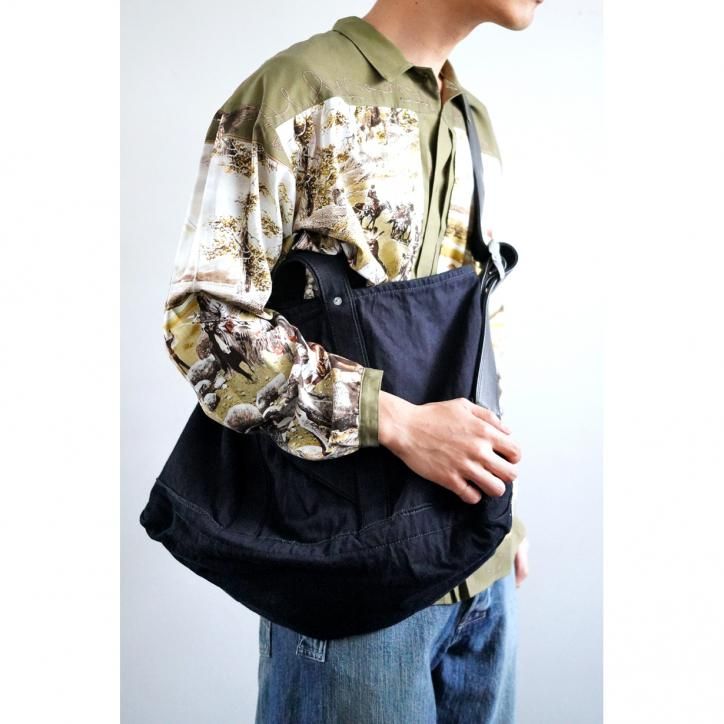 "1960年代のデニムを研究しリプロダクトしたデニム生地を、オーバーダイ加工を施して使用したショルダーストラップ付きバッグ。エイジングによって黒が退色し、インディゴの表情が現れる設計です。デザインは1920〜50年代に登場した米国のツールバッグと、現代のメッセンジャーバッグを再構築しています。ショルダーストラップにはレザーを使用しています。"