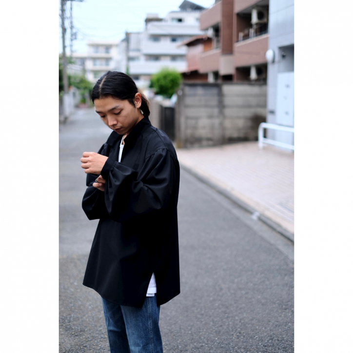 クールで色気を感じるどちらかと言えばドレッシーなアイテムで見られる素材を、カジュアルなスモックシャツライクな表現に落とし込んでいる、