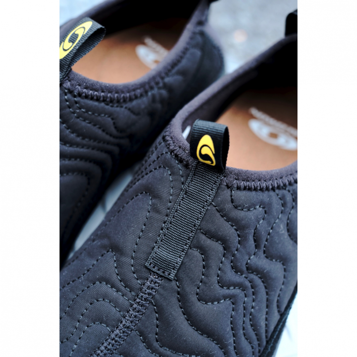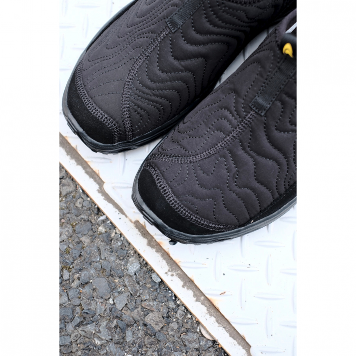 アッパーには、起伏ある地形を思わせる曲線的な等高線模様のステッチを施した、柔らかなキルティング素材を採用。