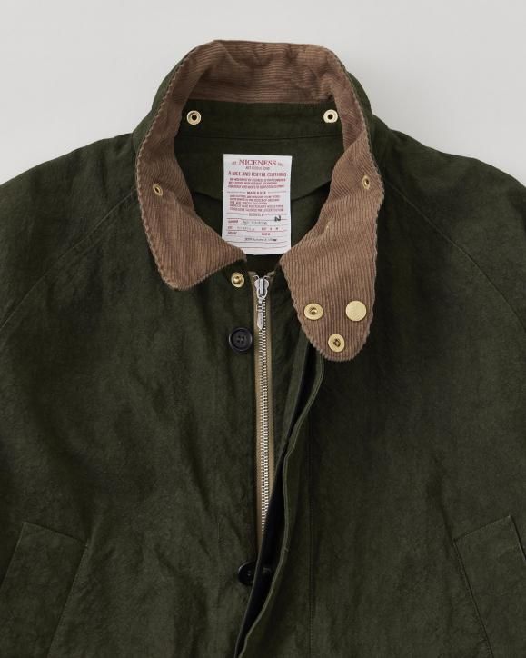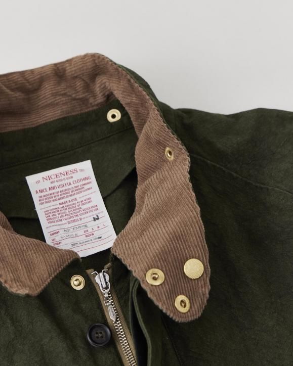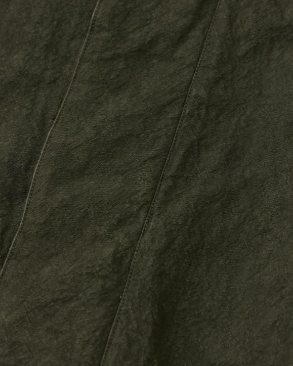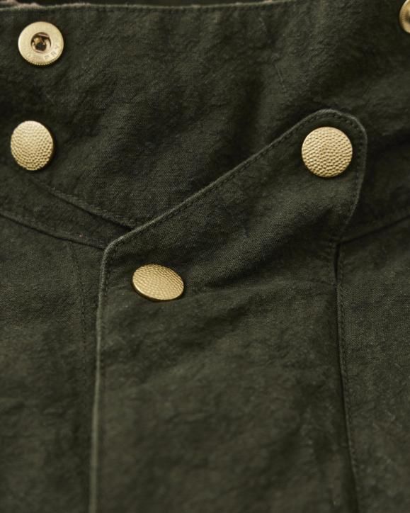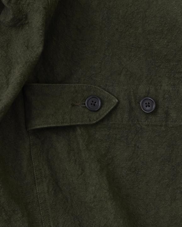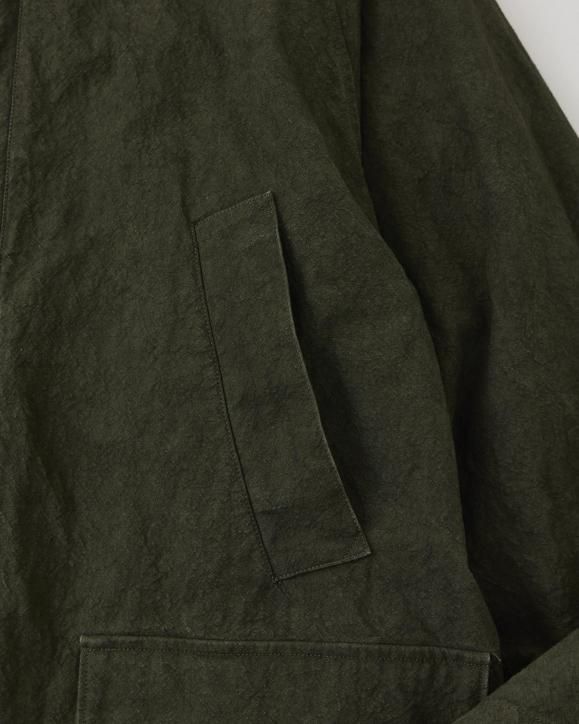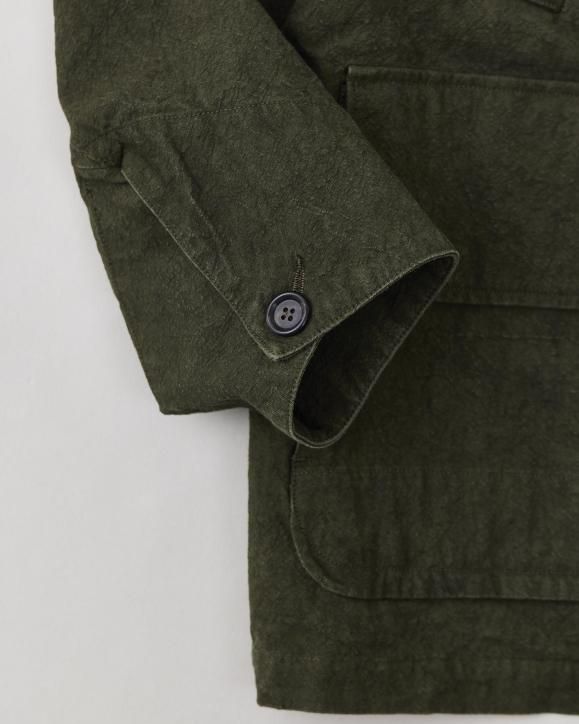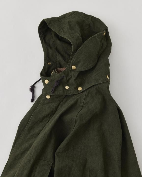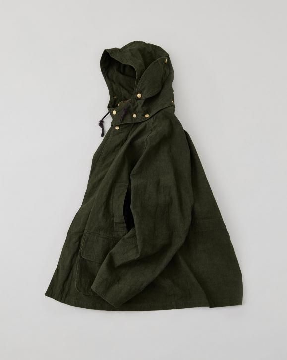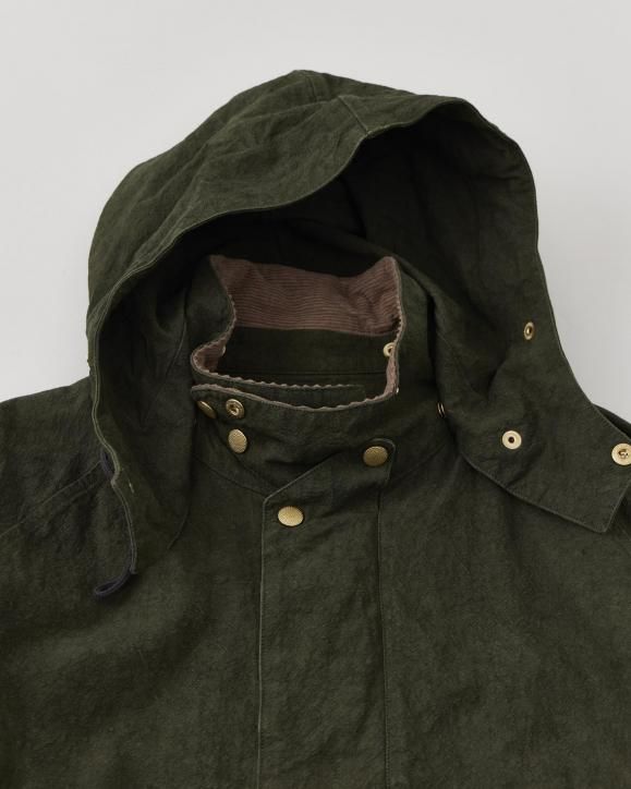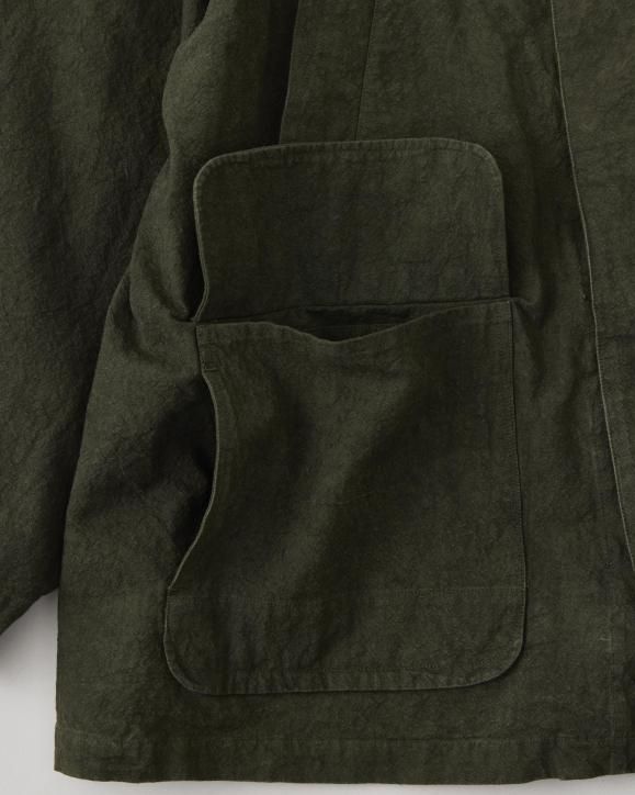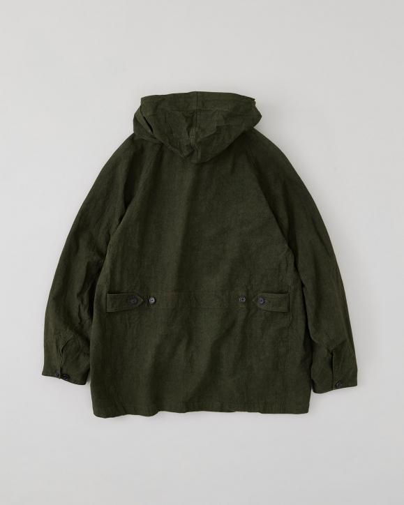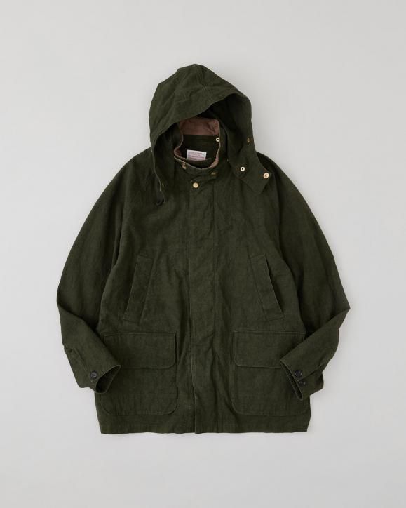 "強撚コットンで織り上げたダック生地に、硫化染めとバイオ加工を施したハンティングジャケット。1950年代のアメリカのカバーオールとイギリスのハンティングジャケットの要素をミックスしたデザインです。生地は1930年代のアメリカ製ファイヤーマンキャンバス地を参考に製作されており、特殊な加工により、ヴィンテージ感のある色合いや凹凸感のある立体的な表情に仕上げています。襟まわりや前立てにはミリタリー由来のディテールを採用。フードは取り外し可能な仕様です。"