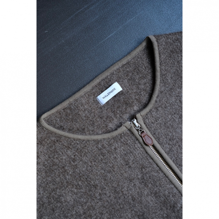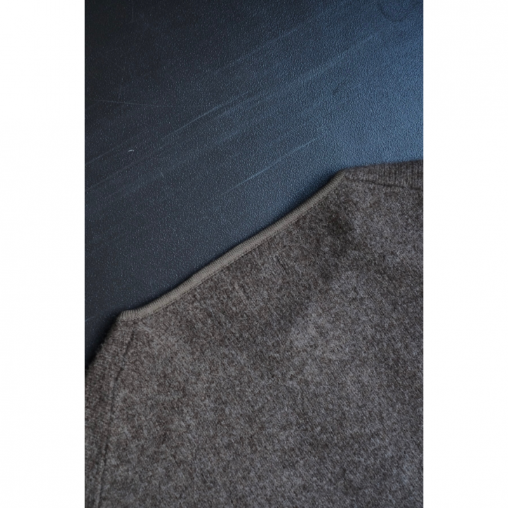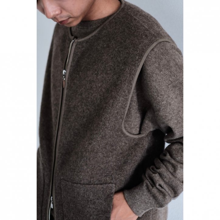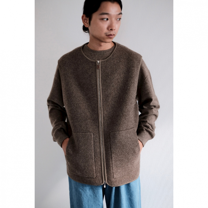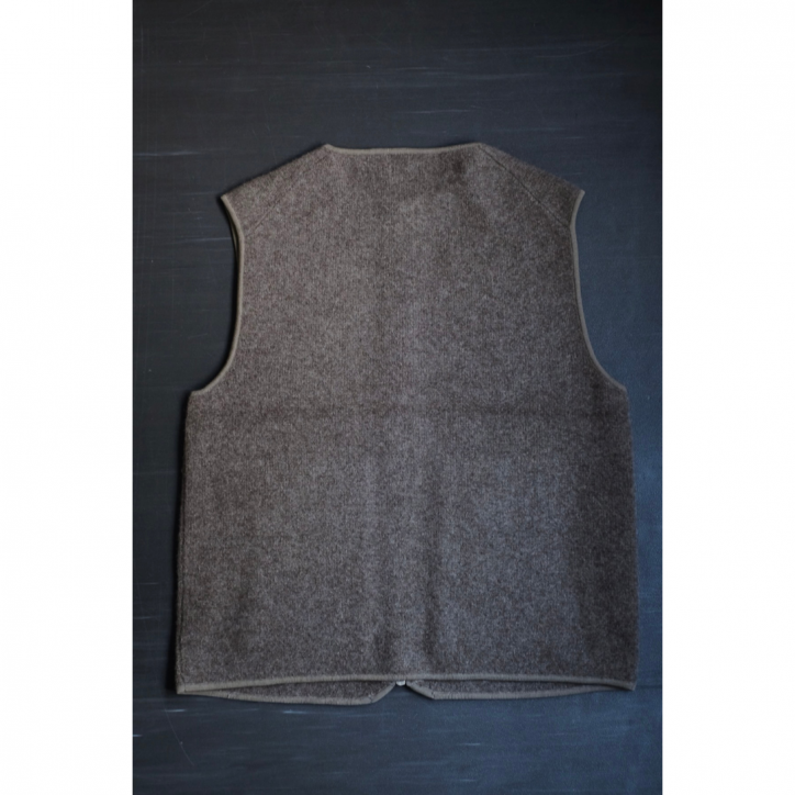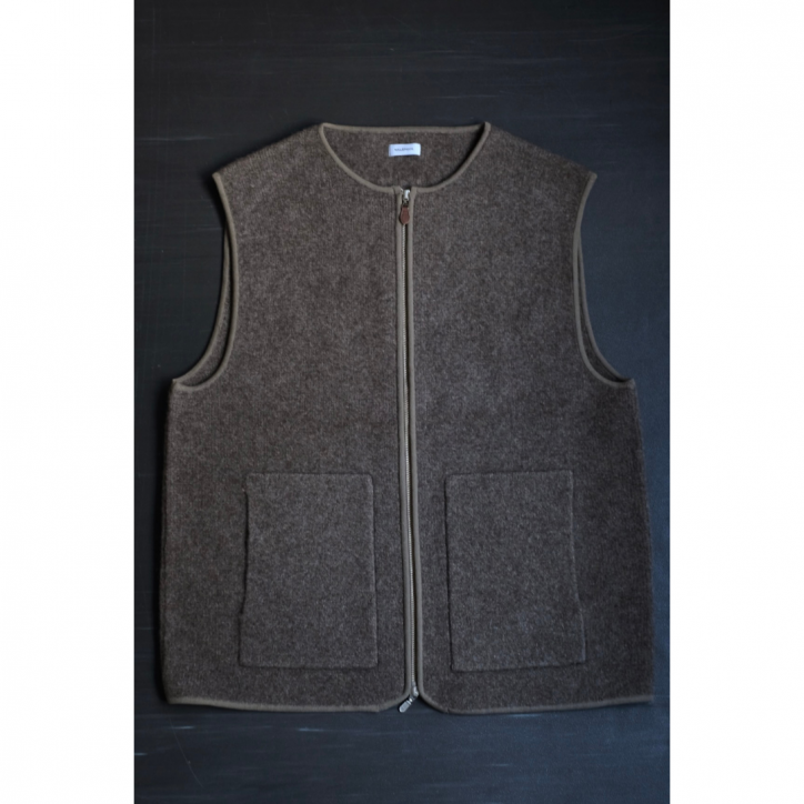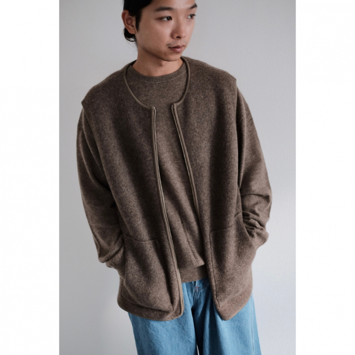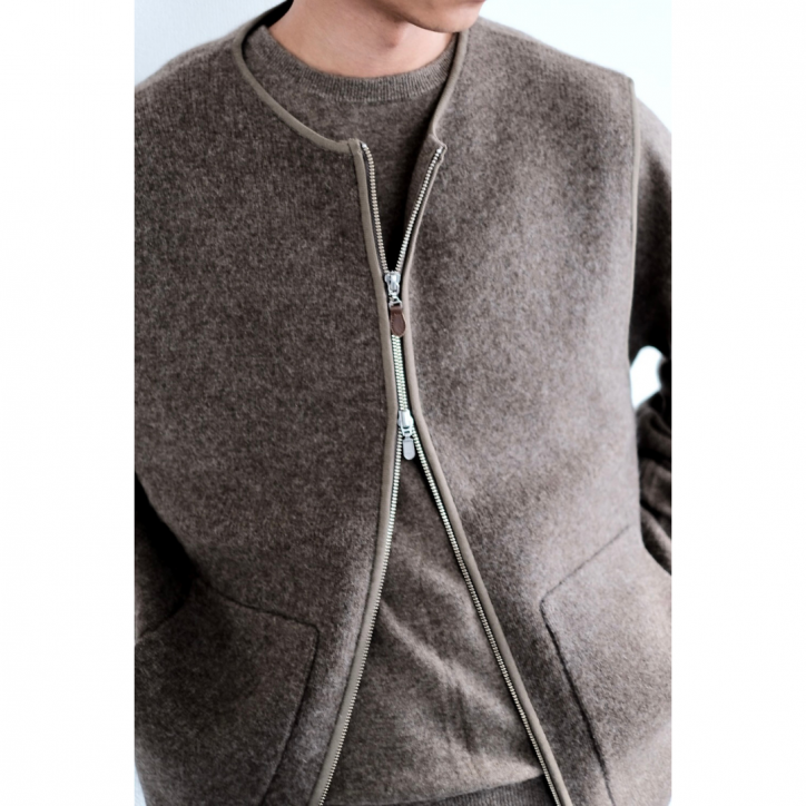こちらは7ゲージで編まれたベーシックな形のノーカラーベスト。着丈が程よく長めなのでアウターライクにも着れるし、コートなどのインナーでも使える高いレイヤード性を持っています。
