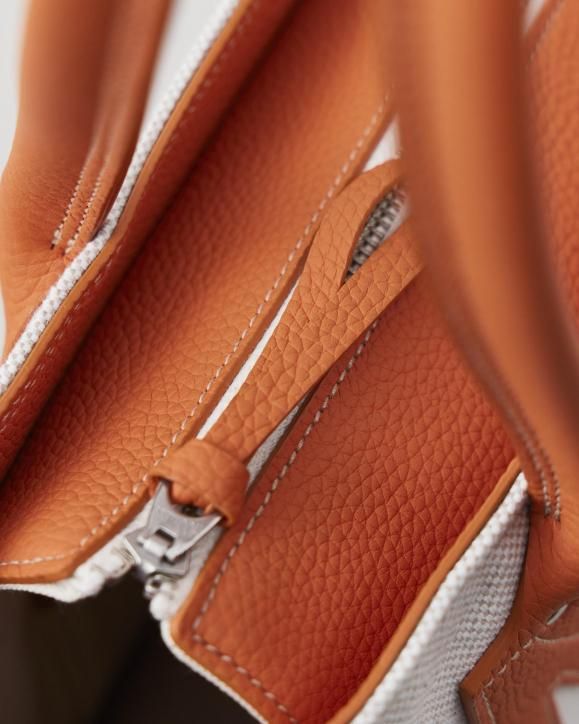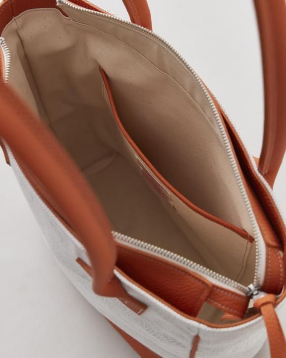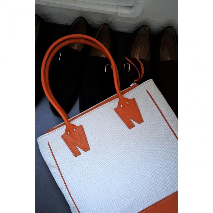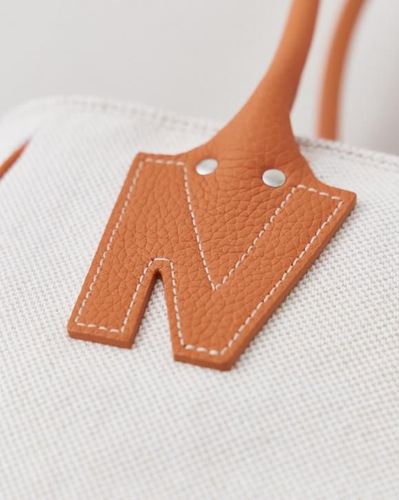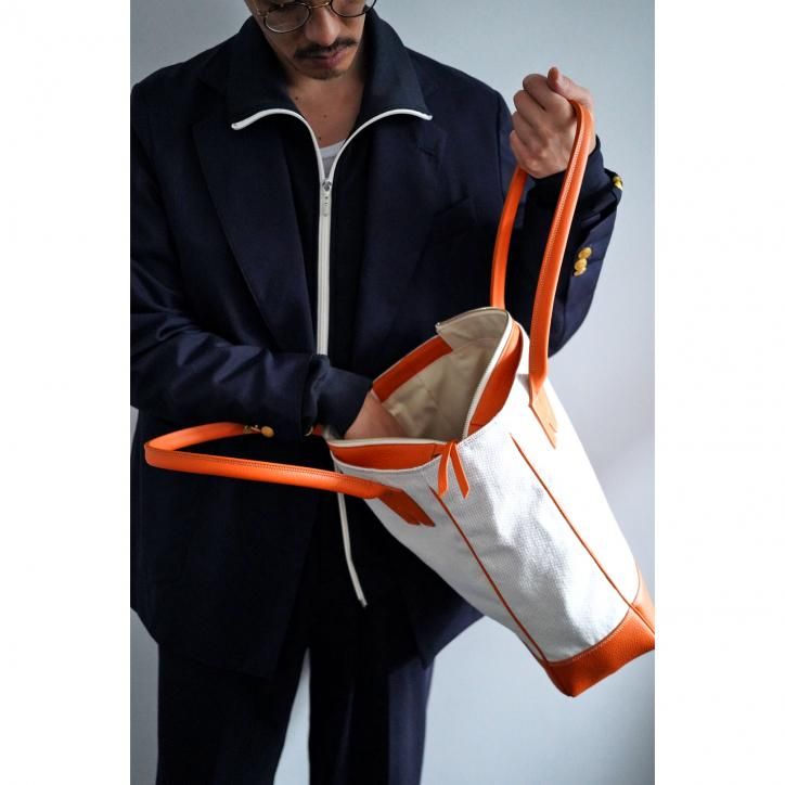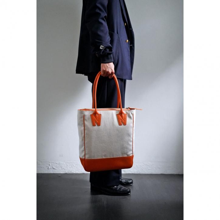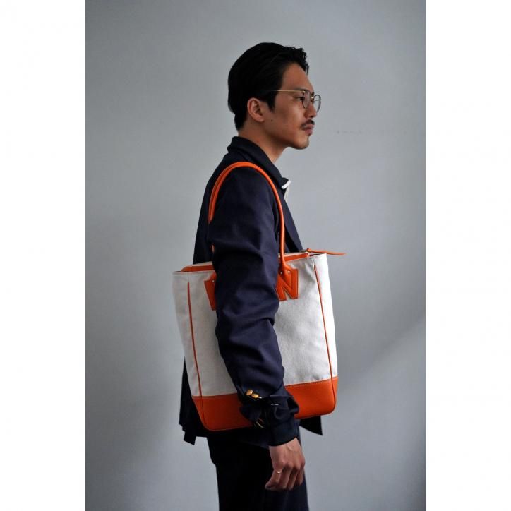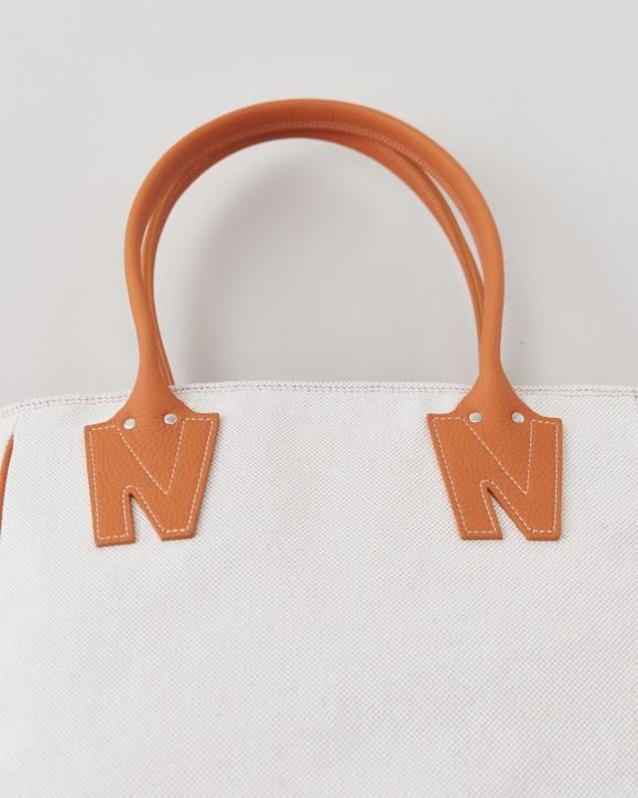 "HAAS社のアルザスレザーとオックスフォードキャンバスで製作したトートバッグ。9種類のワックスとオイルを使用したハイブリッド鞣しの美しい仔牛皮革とタテヨコの糸色を打ち替えて織り上げたキャンバス生地のコントラストが印象的です。1950年代のハンティングトートバッグをリファレンスし、Nを形どったハンドルがアイコニックなデザインとなっています。"