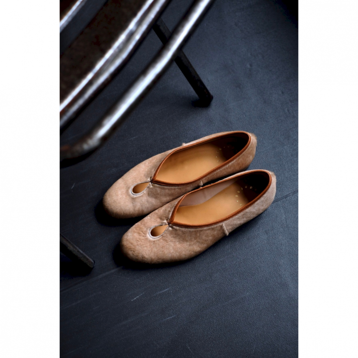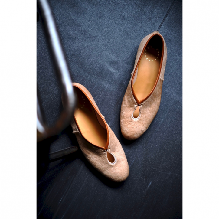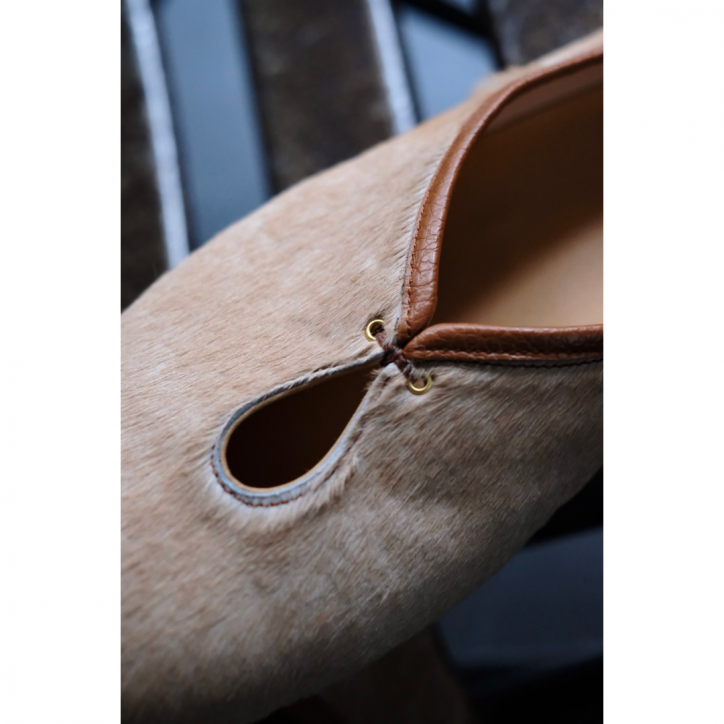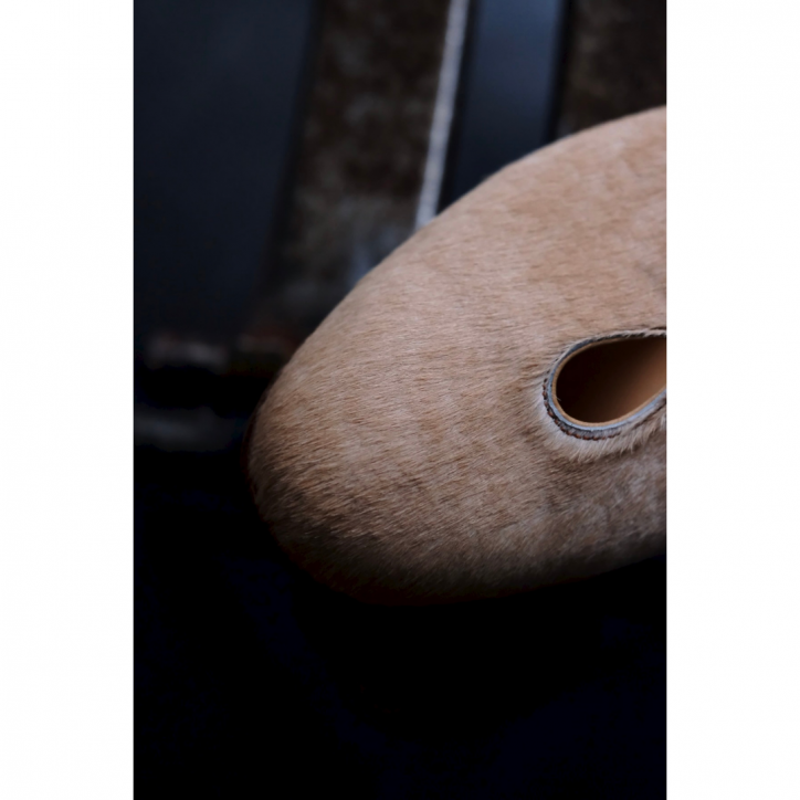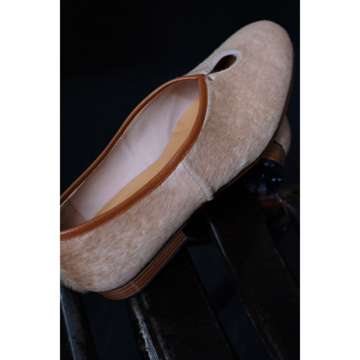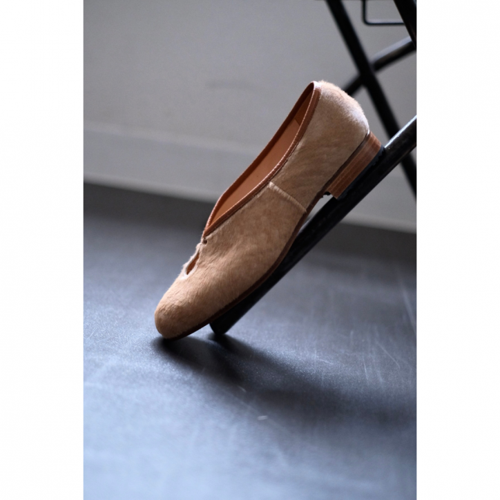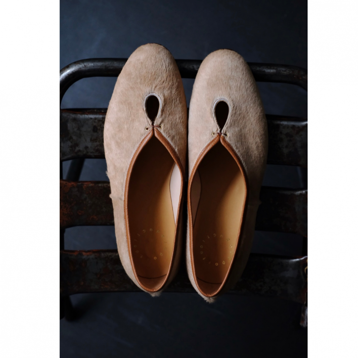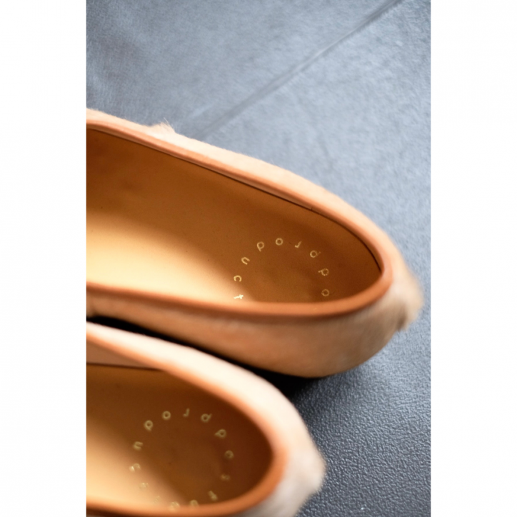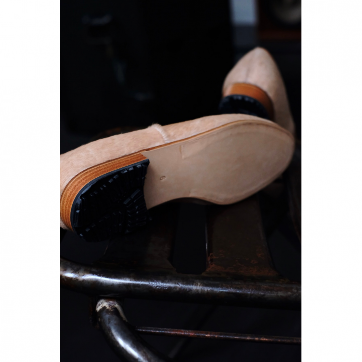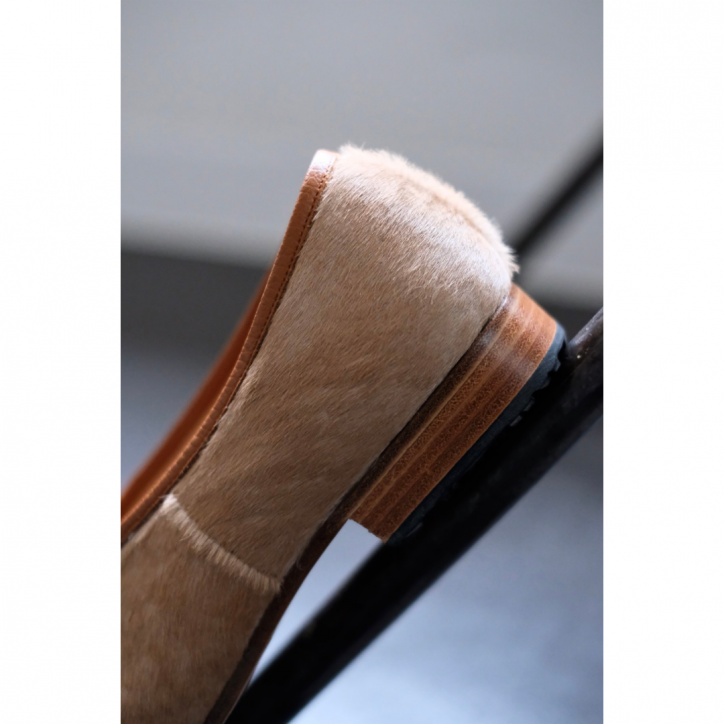 毛が残っている分、野生味があるけど、ベースが子牛なので繊細でしなやかで非常に柔らかい、まさにこのTear Pumpsにぴったりの革。