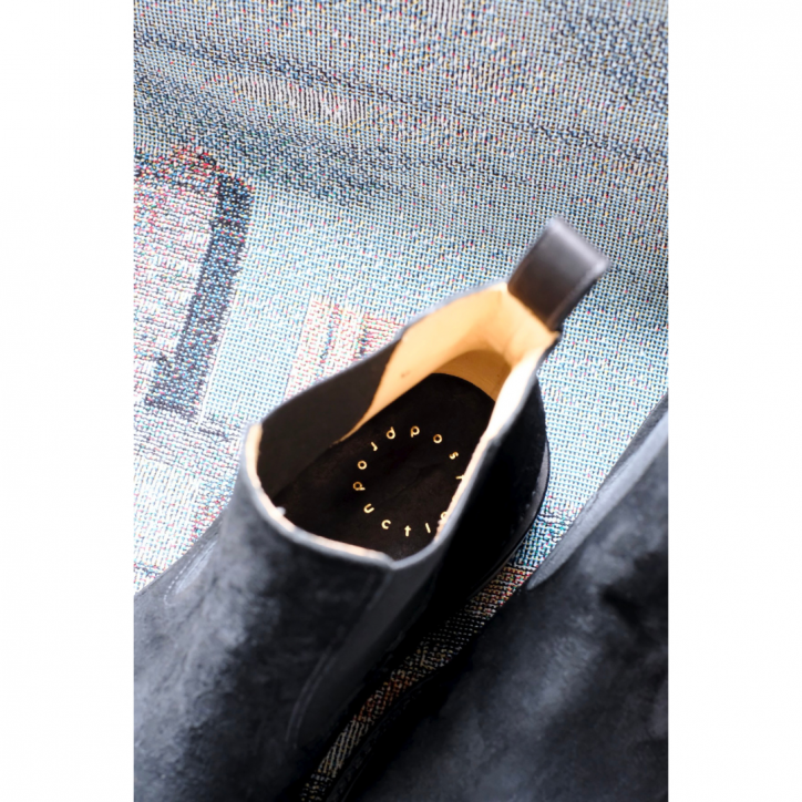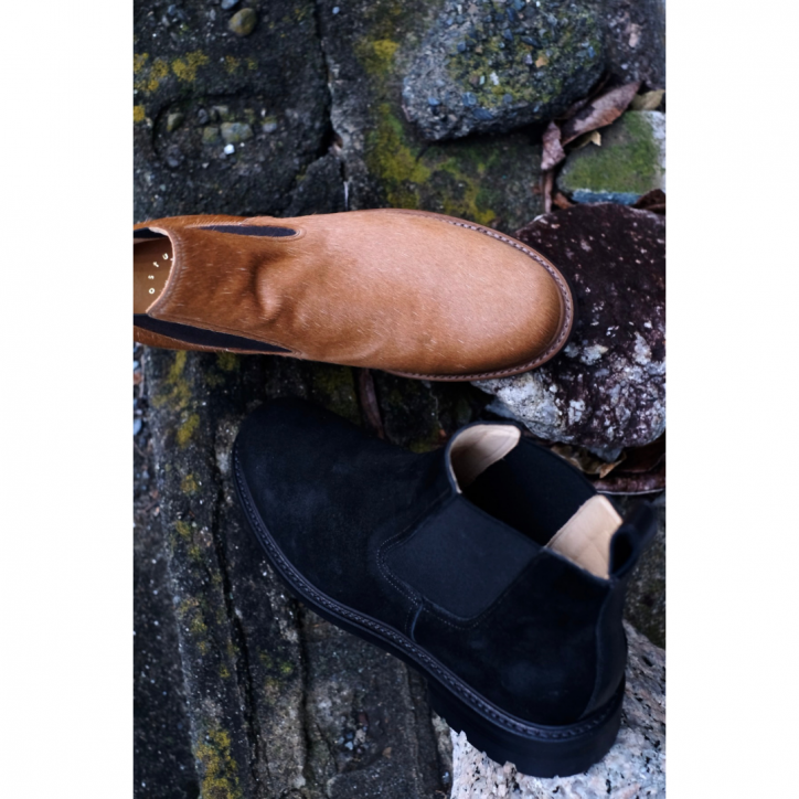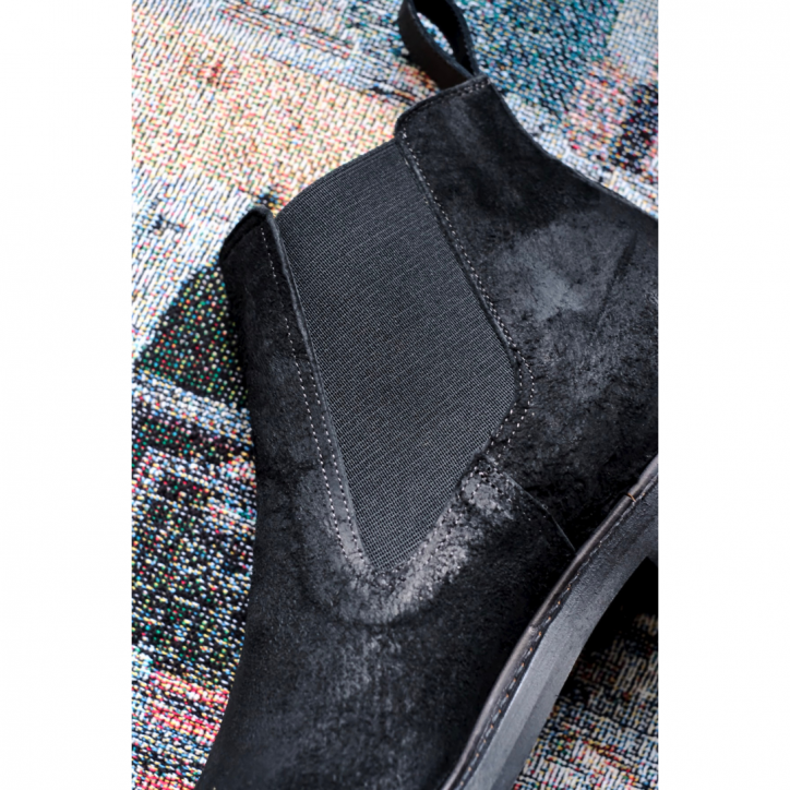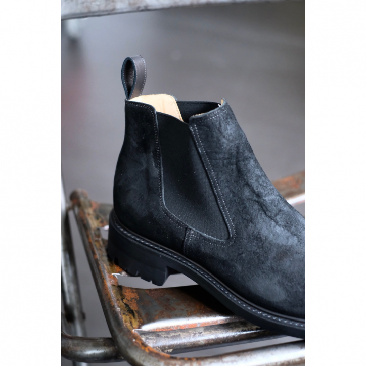 見慣れたカーフとは明らかに異なる、重く燻ったような、光沢の少ない黒。