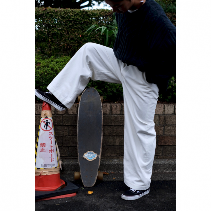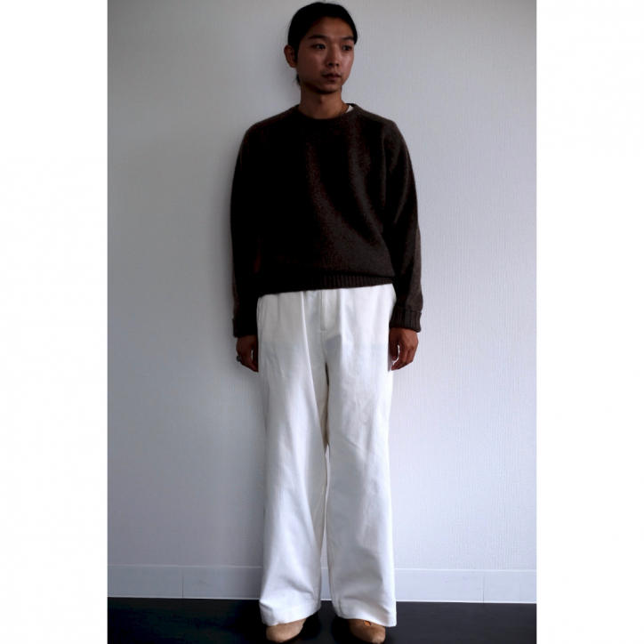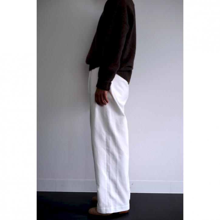 変わったことはしていない、なんていっても、生地のクオリティと縫製の美しさなのからか、本当はパターンが秀逸だからなのか、どの季節でも活躍してくれそうなラフさと美しさを兼ね備えた不思議なシルエットです。極太のストレートスラックス感覚で履いてもハマってしまうのが、このパンツの魔力。