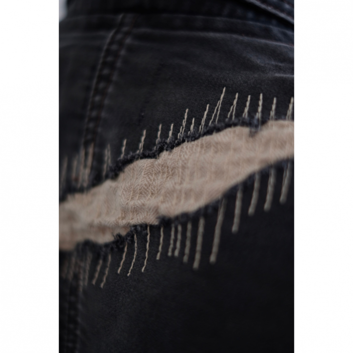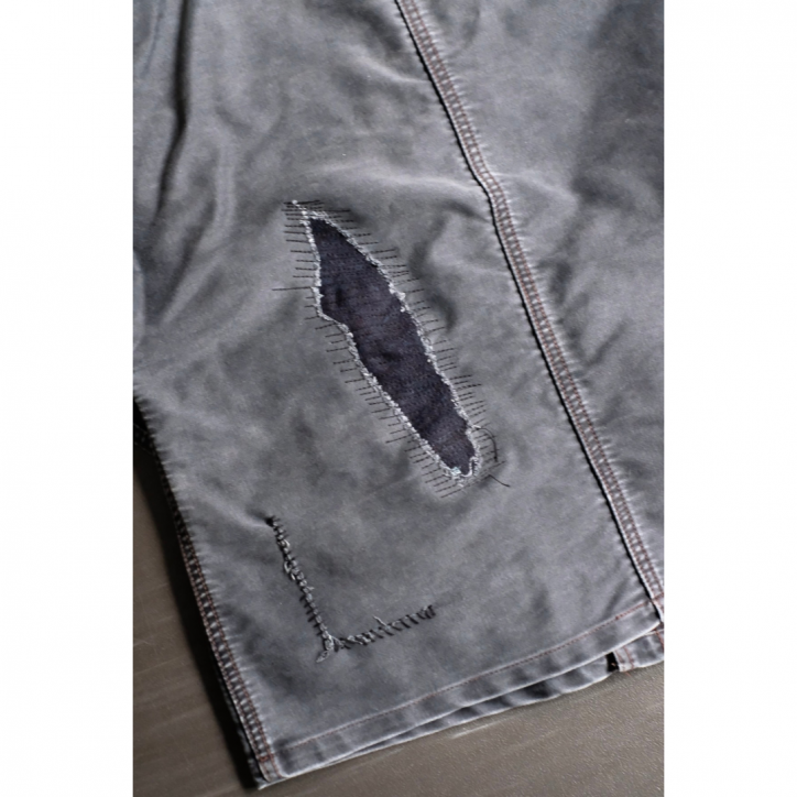 金山さんがモールスキンに魅力と感動を覚えた点が幾重にも重なった当て布のリペア跡だそう。