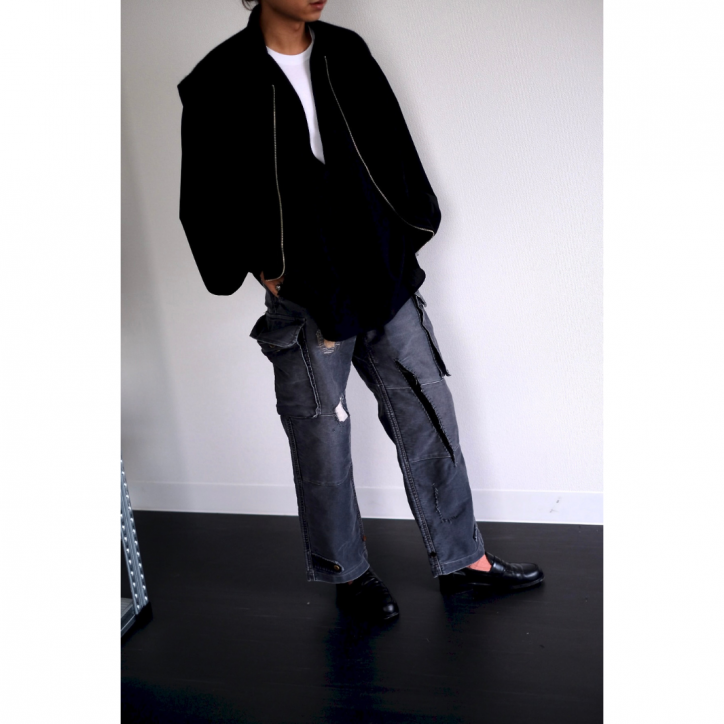 ハードに加工されたパンツなので、トップスはなるべく綺麗めなアイテムを持ってくるとバランスよくスタイリングに落とし込めると思います。