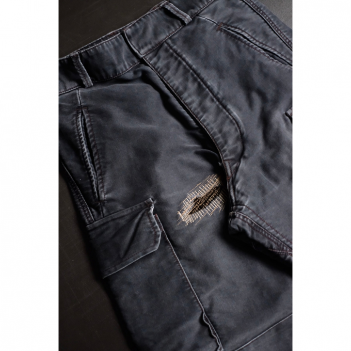 金山さんがモールスキンに魅力と感動を覚えた点が幾重にも重なった当て布のリペア跡だそう。